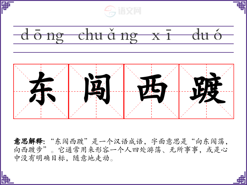 “东闯西踱”这一成语最早出现在古代文献中,具体的出处并不明确,但它的构成反映了传统文学中对游荡和漂泊生活的描写。成语中的“东”和“西”象征着不同的方向,代表着一种无定向的生活状态。