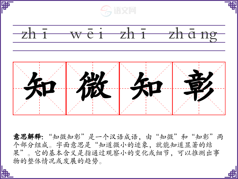 “知微知彰”是一个汉语成语,由“知微”和“知彰”两个部分组成。字面意思是“知道微小的迹象,就能知道显著的结果”。它的基本含义是指通过观察小的变化或细节,可以推测出事物的整体情况或发展的趋势。