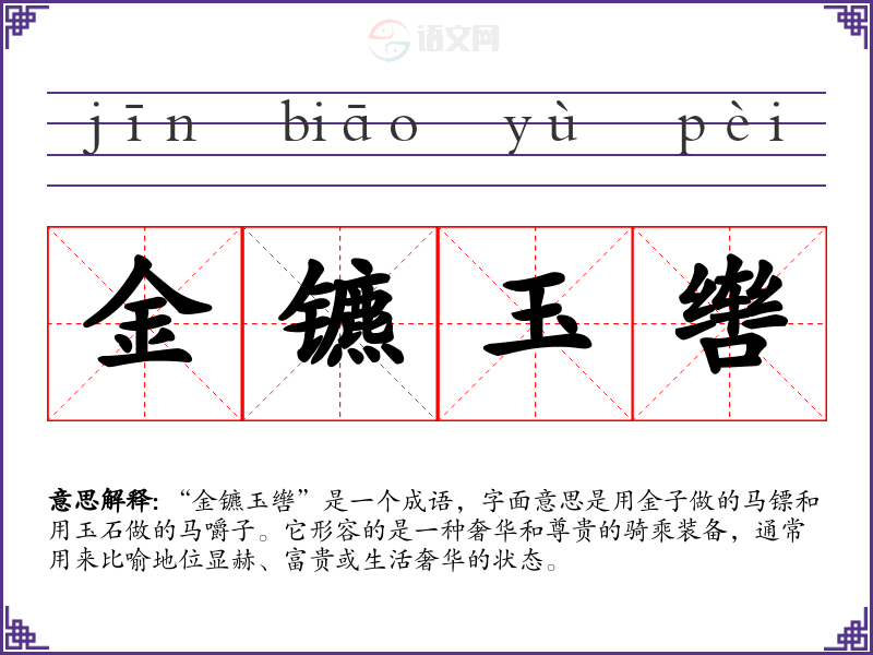 “金镳玉辔”是一个成语,字面意思是用金子做的马镖和用玉石做的马嚼子。它形容的是一种奢华和尊贵的骑乘装备,通常用来比喻地位显赫、富贵或生活奢华的状态。