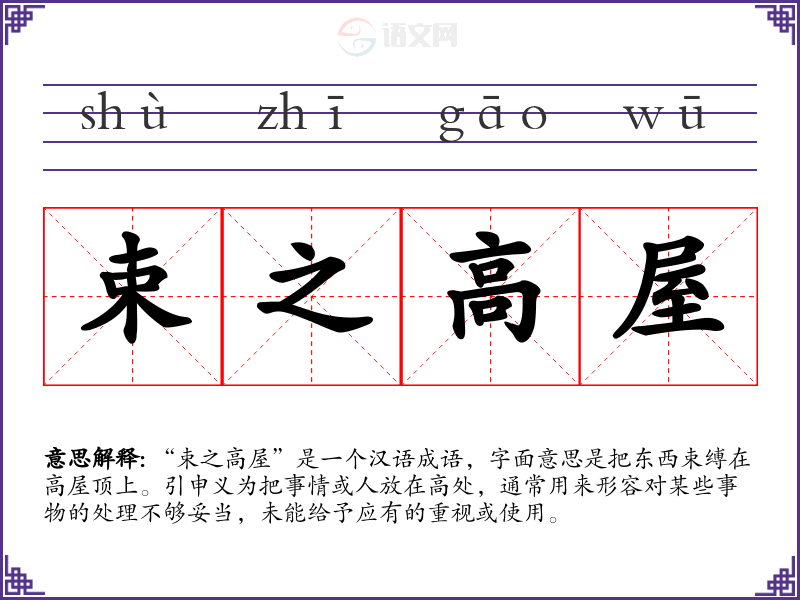 “束之高屋”是一个汉语成语,字面意思是把东西束缚在高屋顶上。引申义为把事情或人放在高处,通常用来形容对某些事物的处理不够妥当,未能给予应有的重视或使用。