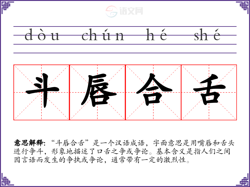 在英语中,类似的表达是“word fight”或“verbal sparring”,也用于描述口头上的争斗。然而,中文的“斗唇合舌”更具形象性,强调了嘴唇和舌头的动作,使得语言的争论更为生动。