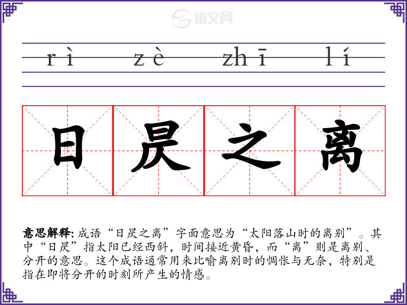 成语“日昃之离”字面意思为“太阳落山时的离别”。其中“日昃”指太阳已经西斜,时间接近黄昏,而“离”则是离别、分开的意思。这个成语通常用来比喻离别时的惆怅与无奈,特别是指在即将分开的时刻所产生的情感。