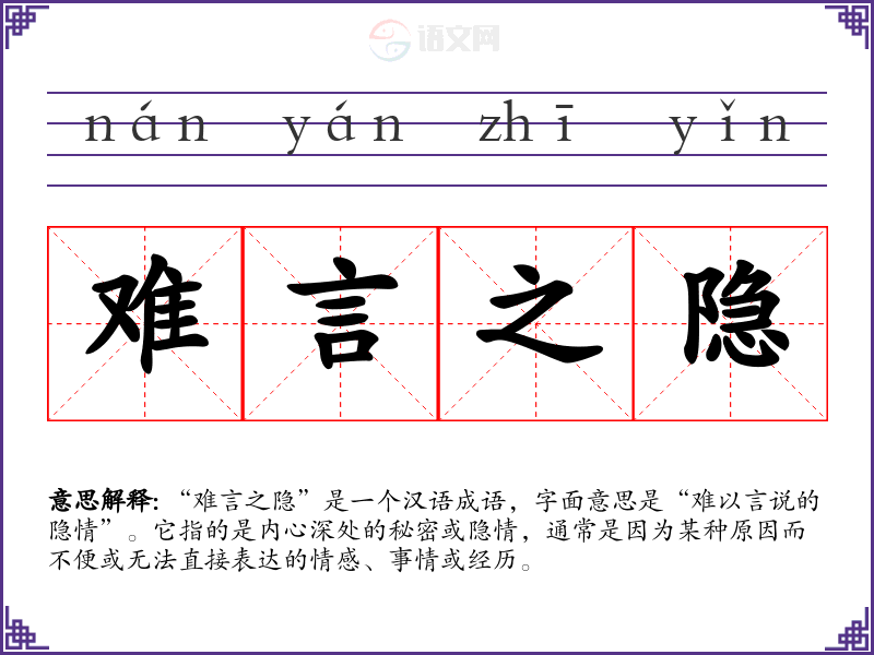 “难言之隐”是一个汉语成语,字面意思是“难以言说的隐情”。它指的是内心深处的秘密或隐情,通常是因为某种原因而不便或无法直接表达的情感、事情或经历。
