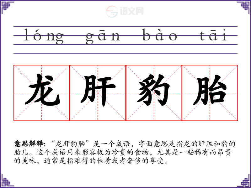 “龙肝豹胎”是一个成语,字面意思是指龙的肝脏和豹的胎儿。这个成语用来形容极为珍贵的食物,尤其是一些稀有而昂贵的美味,通常是指难得的佳肴或者奢侈的享受。