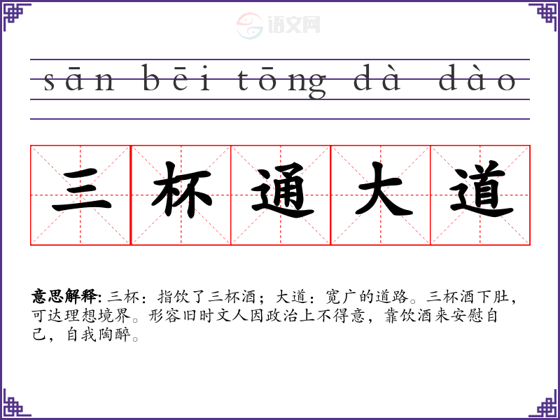 三杯:指饮了三杯酒;大道:宽广的道路。三杯酒下肚,可达理想境界。形容旧时文人因政治上不得意,靠饮酒来安慰自己,自我陶醉。