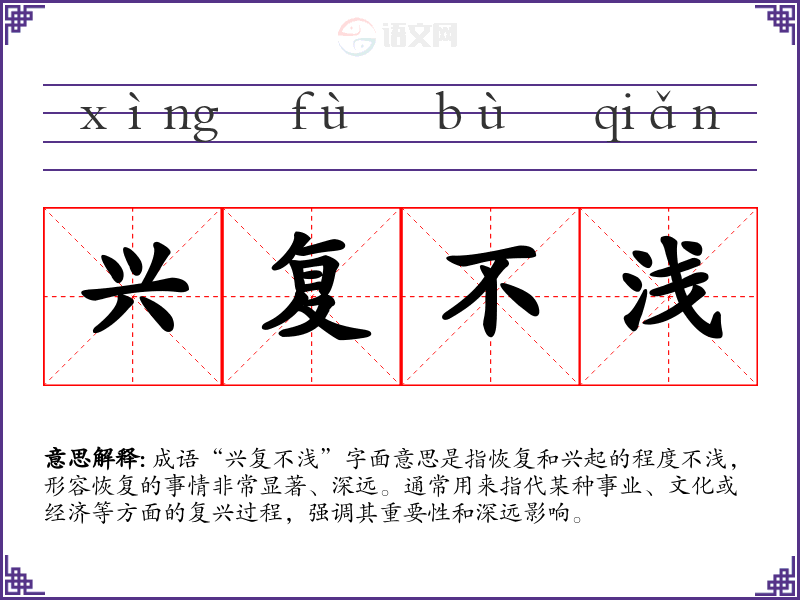 成语“兴复不浅”字面意思是指恢复和兴起的程度不浅,形容恢复的事情非常显著、深远。通常用来指代某种事业、文化或经济等方面的复兴过程,强调其重要性和深远影响。