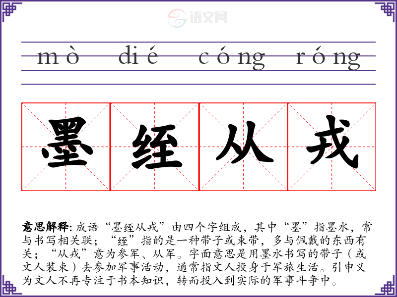 成语“墨绖从戎”由四个字组成,其中“墨”指墨水,常与书写相关联;“绖”指的是一种带子或束带,多与佩戴的东西有关;“从戎”意为参军、从军。字面意思是用墨水书写的带子(或文人装束)去参加军事活动,通常指文人投身于军旅生活。引申义为文人不再专注于书本知识,转而投入到实际的军事斗争中。