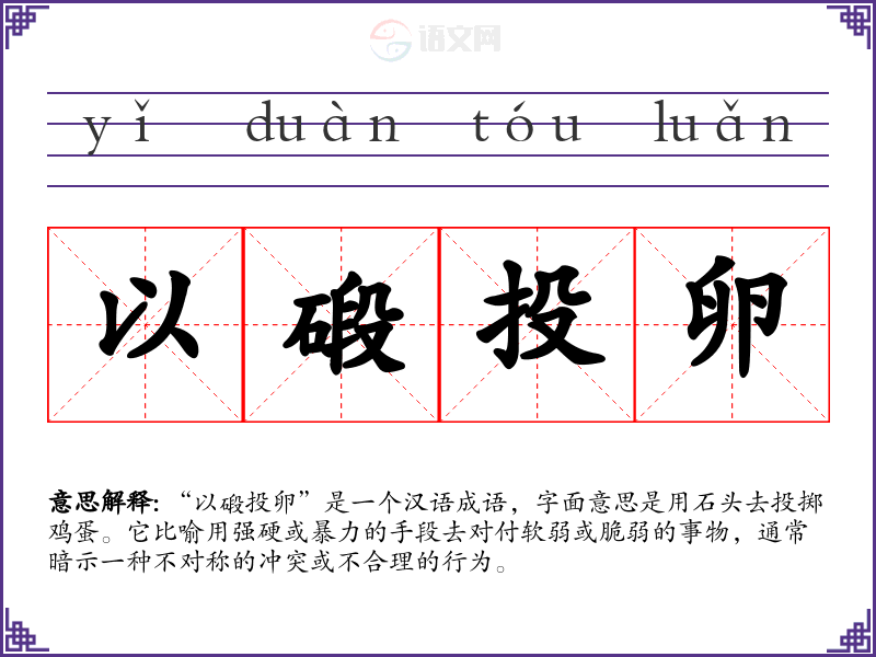 通过对“以碫投卵”的深入分析,我认识到它不仅是一句成语,更是一种智慧和警示。在语言学*和表达中,理解这样的成语能够帮助我们更好地传达思想和情感,同时也增强了我们的思维深度和表达能力。这一成语在当今社会依然适用,提醒我们在面对冲突时更注重方式和方法。