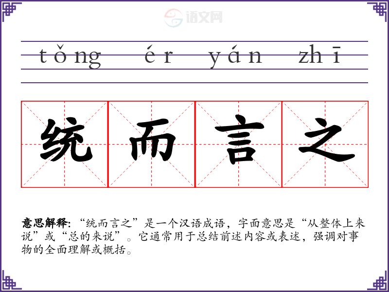“统而言之”是一个汉语成语,字面意思是“从整体上来说”或“总的来说”。它通常用于总结前述内容或表述,强调对事物的全面理解或概括。