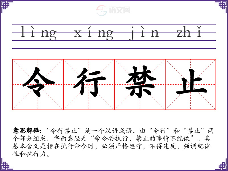 “令行禁止”是一个汉语成语,由“令行”和“禁止”两个部分组成。字面意思是“命令要执行,禁止的事情不能做”。其基本含义是指在执行命令时,必须严格遵守,不得违反,强调纪律性和执行力。