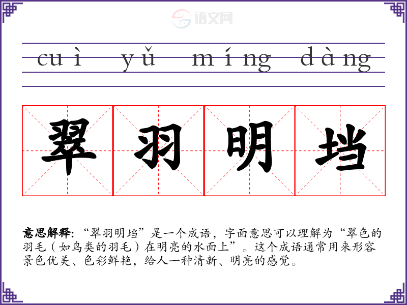 “翠羽明垱”是一个成语,字面意思可以理解为“翠色的羽毛(如鸟类的羽毛)在明亮的水面上”。这个成语通常用来形容景色优美、色彩鲜艳,给人一种清新、明亮的感觉。