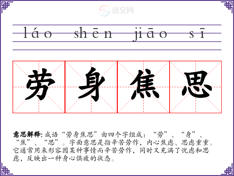 成语“劳身焦思”由四个字组成:“劳”、“身”、“焦”、“思”。字面意思是指辛苦劳作,内心焦虑、思虑重重。它通常用来形容因某种事情而辛苦劳作,同时又充满了忧虑和思虑,反映出一种身心俱疲的状态。