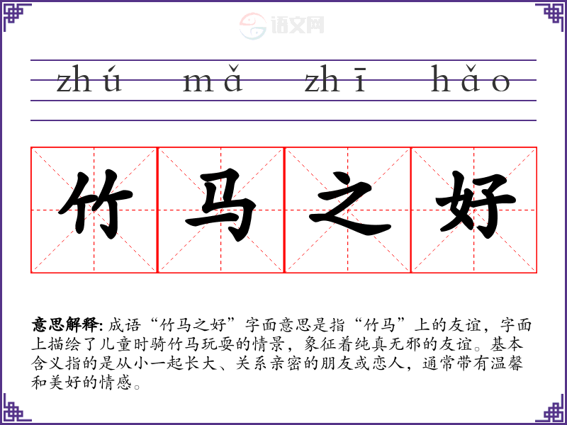 成语“竹马之好”字面意思是指“竹马”上的友谊,字面上描绘了儿童时骑竹马玩耍的情景,象征着纯真无邪的友谊。基本含义指的是从小一起长大、关系亲密的朋友或恋人,通常带有温馨和美好的情感。