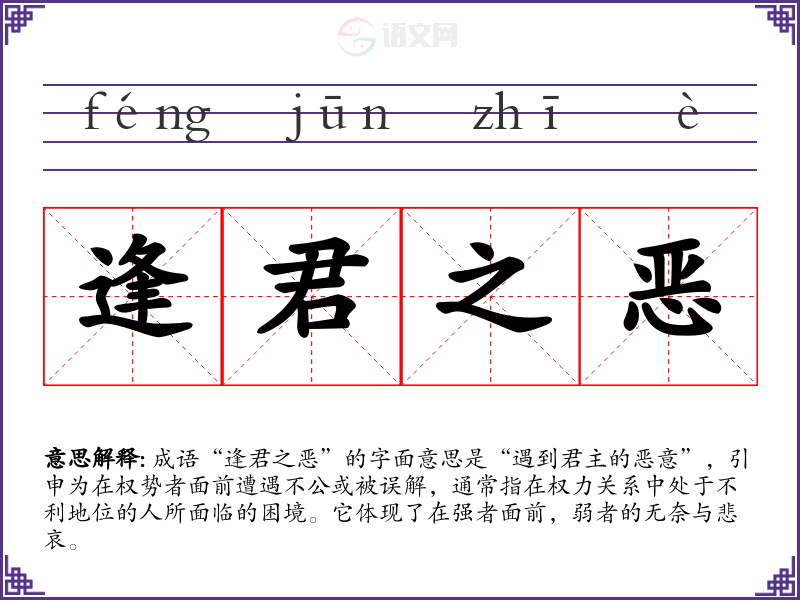 成语“逢君之恶”的字面意思是“遇到君主的恶意”,引申为在权势者面前遭遇不公或被误解,通常指在权力关系中处于不利地位的人所面临的困境。它体现了在强者面前,弱者的无奈与悲哀。