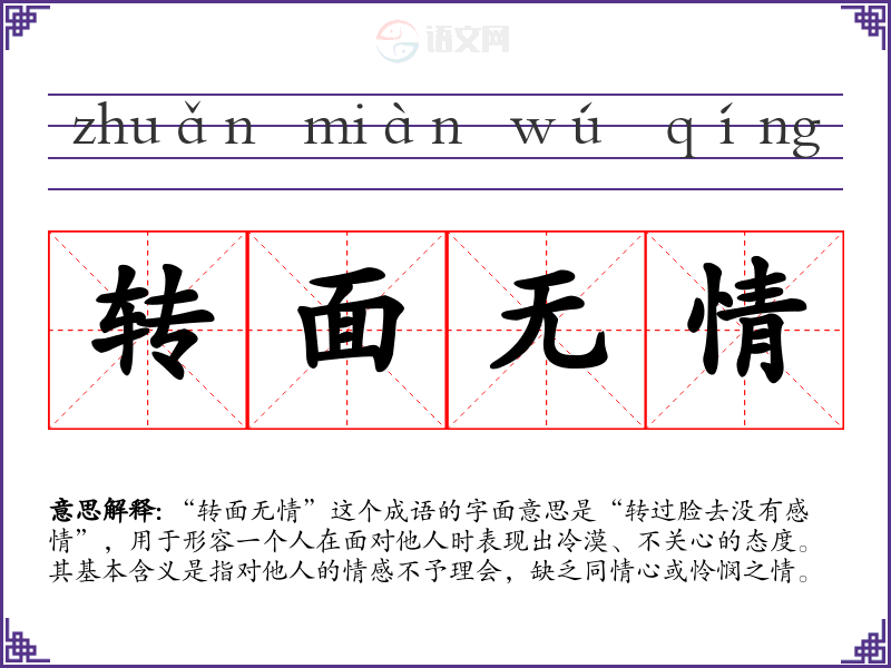“转面无情”这个成语的字面意思是“转过脸去没有感情”,用于形容一个人在面对他人时表现出冷漠、不关心的态度。其基本含义是指对他人的情感不予理会,缺乏同情心或怜悯之情。