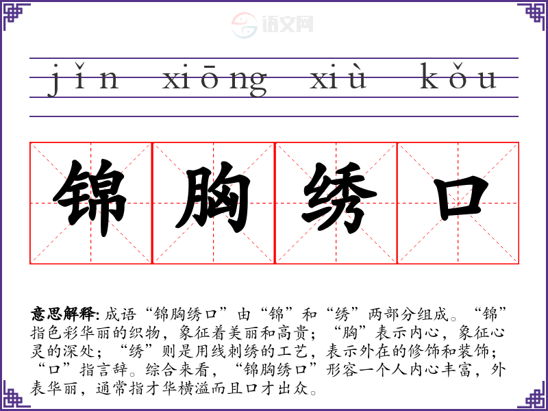 成语“锦胸绣口”由“锦”和“绣”两部分组成。“锦”指色彩华丽的织物,象征着美丽和高贵;“胸”表示内心,象征心灵的深处;“绣”则是用线刺绣的工艺,表示外在的修饰和装饰;“口”指言辞。综合来看,“锦胸绣口”形容一个人内心丰富,外表华丽,通常指才华横溢而且口才出众。