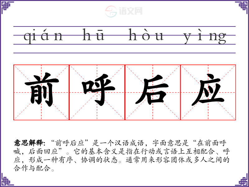 “前呼后应”是一个汉语成语,字面意思是“在前面呼喊,后面回应”。它的基本含义是指在行动或言语上互相配合、呼应,形成一种有序、协调的状态。通常用来形容团体或多人之间的合作与配合。
