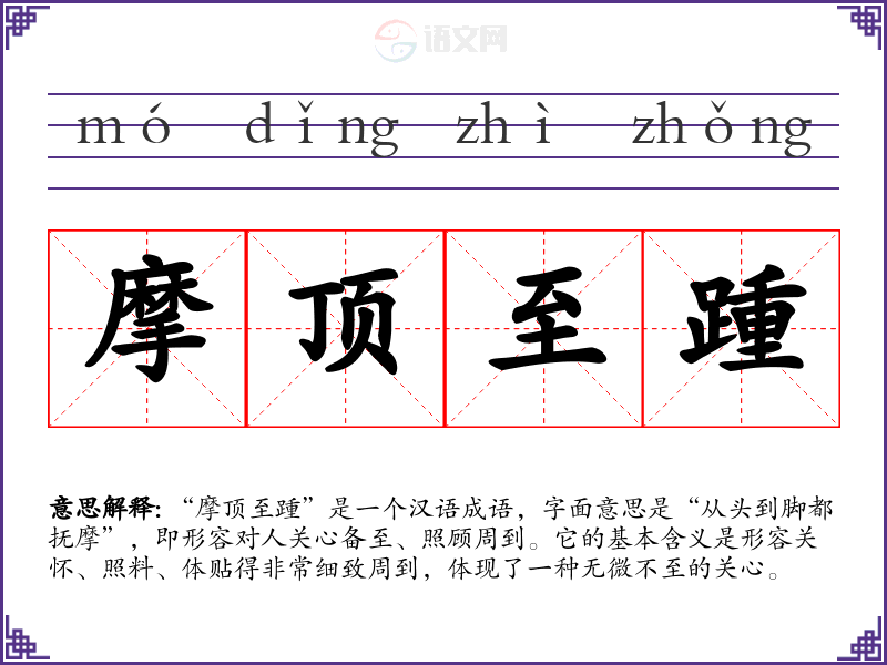“摩顶至踵”是一个汉语成语,字面意思是“从头到脚都抚摩”,即形容对人关心备至、照顾周到。它的基本含义是形容关怀、照料、体贴得非常细致周到,体现了一种无微不至的关心。