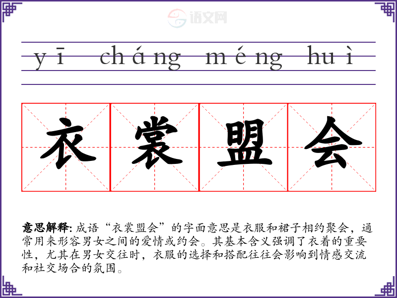 成语“衣裳盟会”的字面意思是衣服和裙子相约聚会,通常用来形容男女之间的爱情或约会。其基本含义强调了衣着的重要性,尤其在男女交往时,衣服的选择和搭配往往会影响到情感交流和社交场合的氛围。