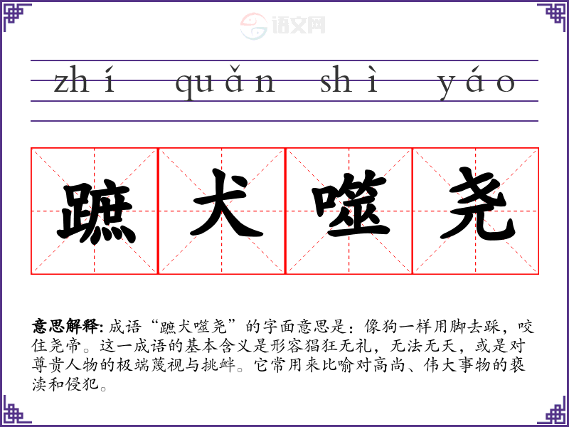 成语“蹠犬噬尧”的字面意思是:像狗一样用脚去踩,咬住尧帝。这一成语的基本含义是形容猖狂无礼,无法无天,或是对尊贵人物的极端蔑视与挑衅。它常用来比喻对高尚、伟大事物的亵渎和侵犯。