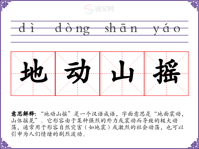 这个成语源于古代**的对自然现象的观察与描述。其中,“地动”指的是地震、地面震动的现象,而“山摇”则形象地描绘了山体因地震而晃动的情景。虽然具体的文学出处不详,但这一成语的使用可以追溯至古代文献中对自然灾害的描绘。