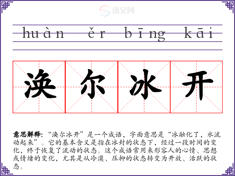 “涣尔冰开”带给人的情感反应是温暖与希望,象征着内心的解放和变化。这种变化常常让人感到释然和愉悦,激励人们在面对困境时,保持积极的心态。