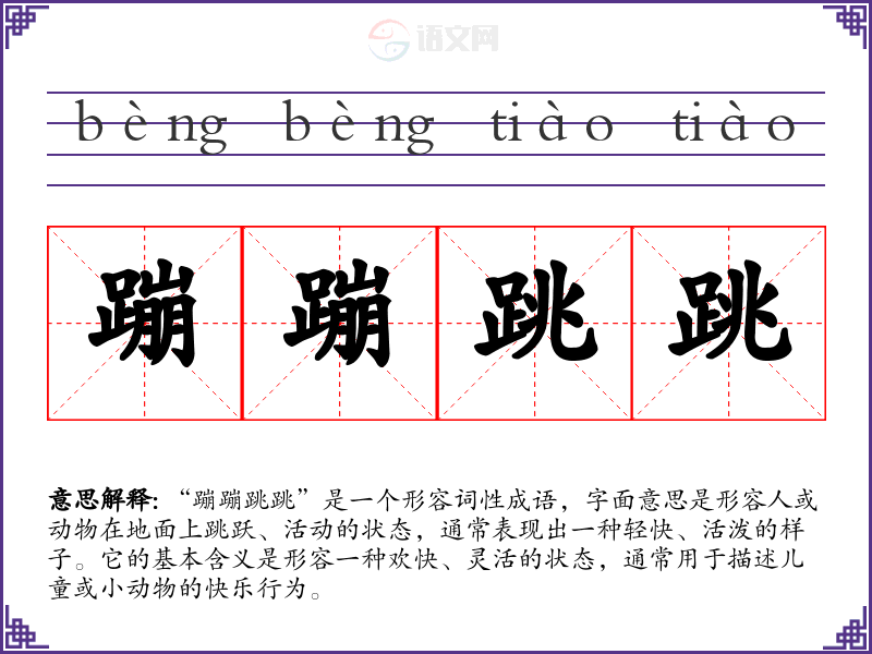 “蹦蹦跳跳”是一个形容词性成语,字面意思是形容人或动物在地面上跳跃、活动的状态,通常表现出一种轻快、活泼的样子。它的基本含义是形容一种欢快、灵活的状态,通常用于描述儿童或小动物的快乐行为。
