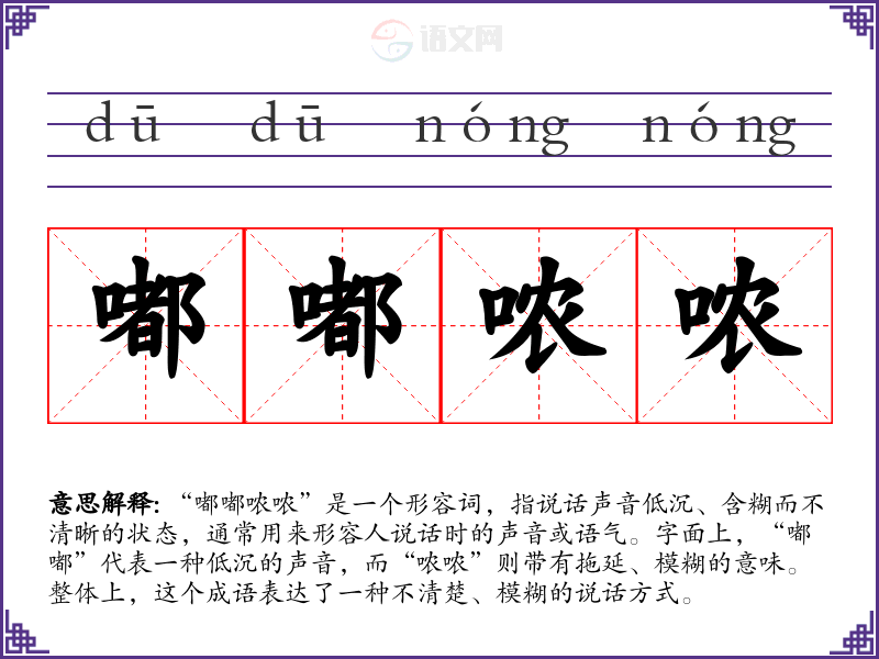 “嘟嘟哝哝”是一个形容词,指说话声音低沉、含糊而不清晰的状态,通常用来形容人说话时的声音或语气。字面上,“嘟嘟”代表一种低沉的声音,而“哝哝”则带有拖延、模糊的意味。整体上,这个成语表达了一种不清楚、模糊的说话方式。