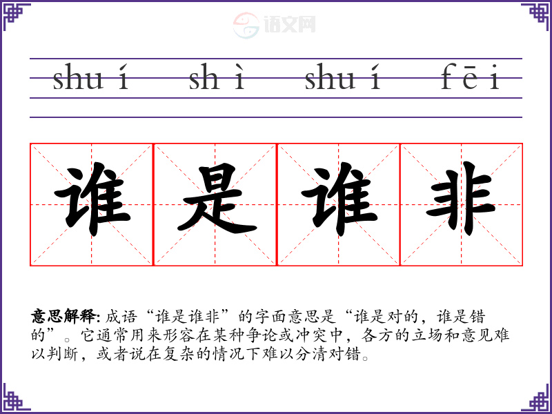 - 文学作品:作家在描绘人物冲突时,常用“谁是谁非”来表现争论的复杂性。