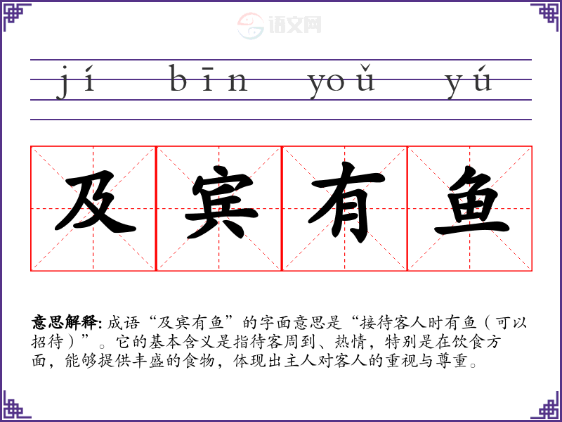 成语“及宾有鱼”的字面意思是“接待客人时有鱼(可以招待)”。它的基本含义是指待客周到、热情,特别是在饮食方面,能够提供丰盛的食物,体现出主人对客人的重视与尊重。