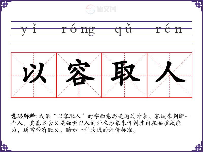 成语“以容取人”的字面意思是通过外表、容貌来判断一个人。其基本含义是强调以人的外在形象来评判其内在品质或能力,通常带有贬义,暗示一种肤浅的评价标准。