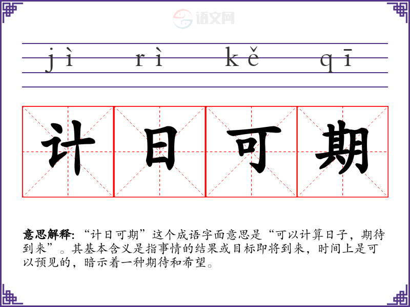 “计日可期”这个成语字面意思是“可以计算日子,期待到来”。其基本含义是指事情的结果或目标即将到来,时间上是可以预见的,暗示着一种期待和希望。