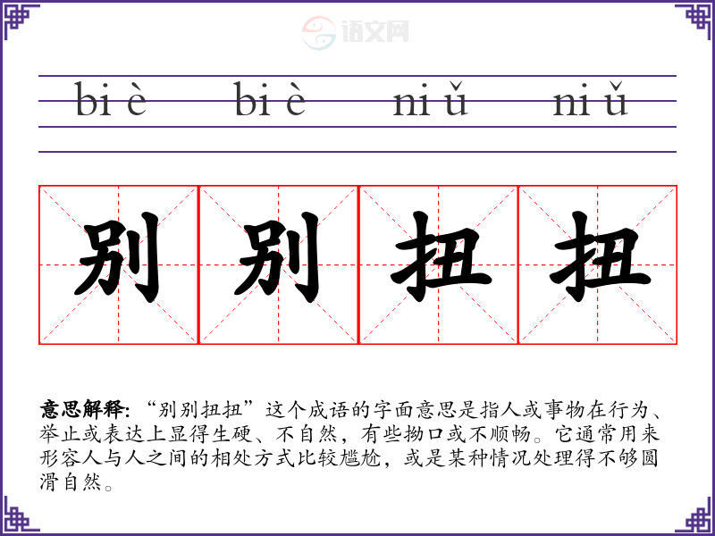 “别别扭扭”这个成语的字面意思是指人或事物在行为、举止或表达上显得生硬、不自然,有些拗口或不顺畅。它通常用来形容人与人之间的相处方式比较尴尬,或是某种情况处理得不够圆滑自然。