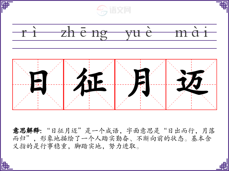 “日征月迈”是一个成语,字面意思是“日出而行,月落而归”,形象地描绘了一个人踏实勤奋、不断向前的状态。基本含义指的是行事稳重,脚踏实地,努力进取。