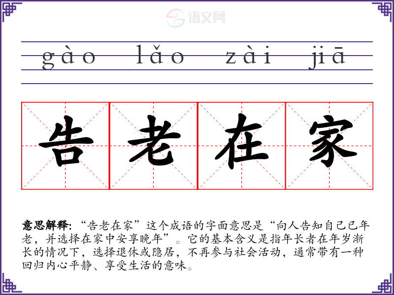 通过对“告老在家”的学,我深刻认识到这个成语不仅仅是关于年老与隐退的表面意思,更是对生活态度的一种反映。在语言学和表达中,理解成语的深层意义可以丰富我们的表达方式,帮助我们更好地传达情感和思想。