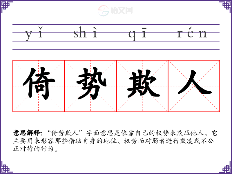“倚势欺人”字面意思是依靠自己的权势来欺压他人。它主要用来形容那些借助自身的地位、权势而对弱者进行欺凌或不公正对待的行为。