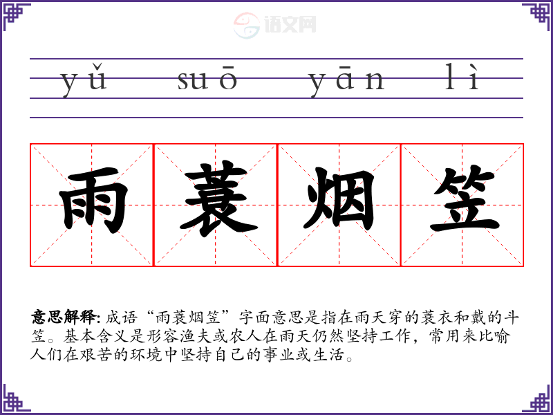 成语“雨蓑烟笠”字面意思是指在雨天穿的蓑衣和戴的斗笠。基本含义是形容渔夫或农人在雨天仍然坚持工作,常用来比喻人们在艰苦的环境中坚持自己的事业或生活。
