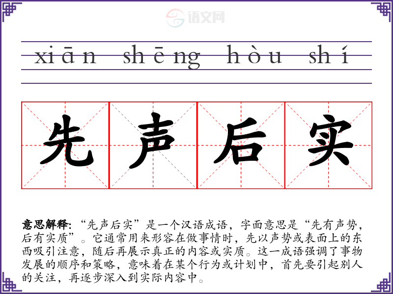 “先声后实”是一个汉语成语,字面意思是“先有声势,后有实质”。它通常用来形容在做事情时,先以声势或表面上的东西吸引注意,随后再展示真正的内容或实质。这一成语强调了事物发展的顺序和策略,意味着在某个行为或计划中,首先要引起别人的关注,再逐步深入到实际内容中。