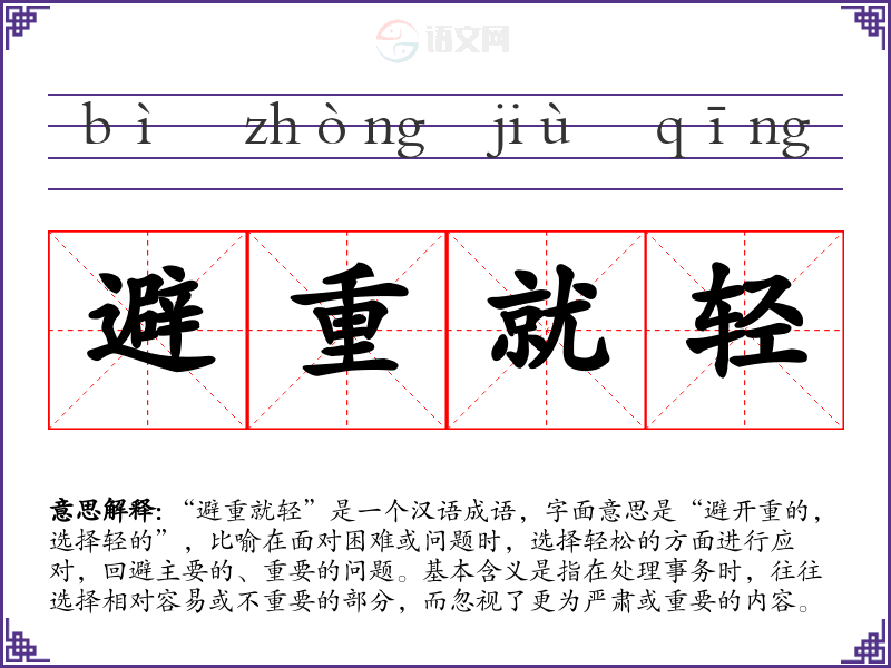 “避重就轻”是一个汉语成语,字面意思是“避开重的,选择轻的”,比喻在面对困难或问题时,选择轻松的方面进行应对,回避主要的、重要的问题。基本含义是指在处理事务时,往往选择相对容易或不重要的部分,而忽视了更为严肃或重要的内容。