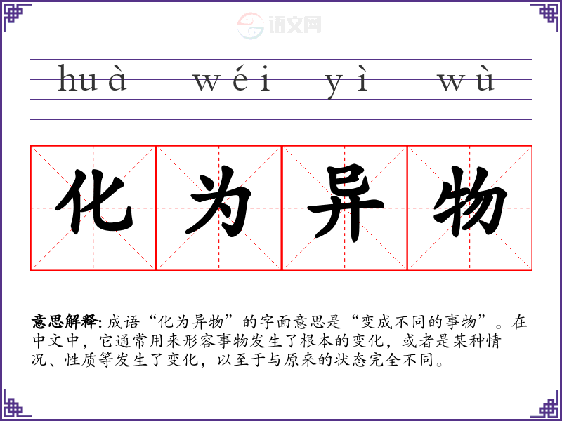 成语“化为异物”的字面意思是“变成不同的事物”。在中文中,它通常用来形容事物发生了根本的变化,或者是某种情况、性质等发生了变化,以至于与原来的状态完全不同。