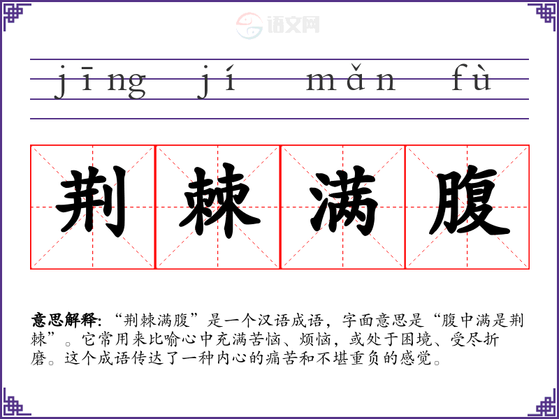 这个成语并没有明确的古典出处,可能是后人在语言表达中逐步形成的。荆棘在古代常被用作比喻困扰与痛苦的象征,因为荆棘刺人,容易让人感到不适。因此,“荆棘满腹”这一表达可以理解为内心被痛苦和烦恼所包围,出自对荆棘的形象联想。