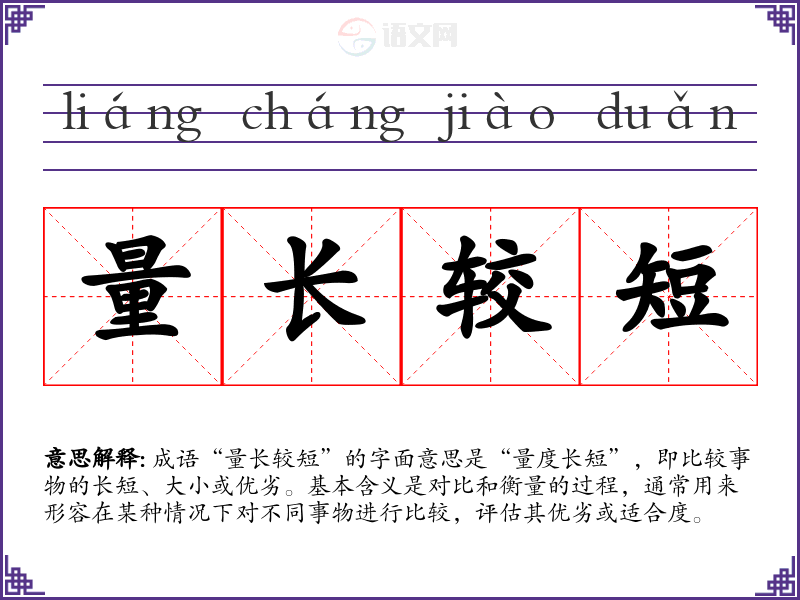 成语“量长较短”的字面意思是“量度长短”,即比较事物的长短、大小或优劣。基本含义是对比和衡量的过程,通常用来形容在某种情况下对不同事物进行比较,评估其优劣或适合度。