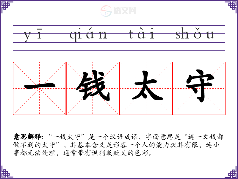 “一钱太守”是一个汉语成语,字面意思是“连一文钱都做不到的太守”。其基本含义是形容一个人的能力极其有限,连小事都无法处理,通常带有讽刺或贬义的色彩。