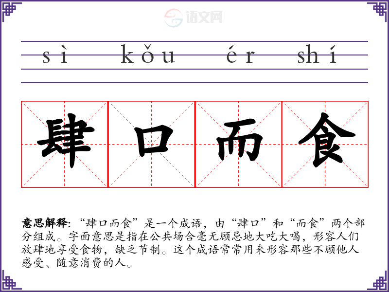 “肆口而食”出自《论语》中,意在批评那些不知节制、放纵自己欲望的人。这个成语反映了儒家文化中对于节制与礼仪的重视,强调个人在公共场合应当注意形象和他人感受。