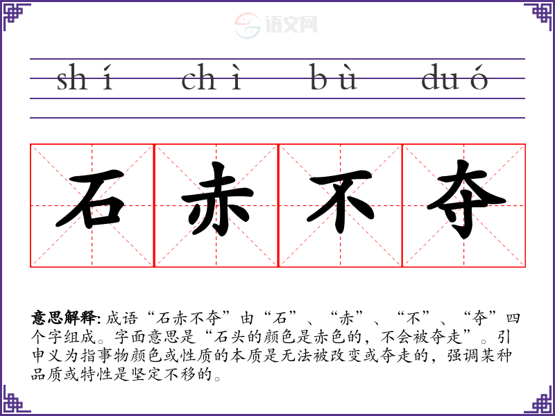 成语“石赤不夺”由“石”、“赤”、“不”、“夺”四个字组成。字面意思是“石头的颜色是赤色的,不会被夺走”。引申义为指事物颜色或性质的本质是无法被改变或夺走的,强调某种品质或特性是坚定不移的。