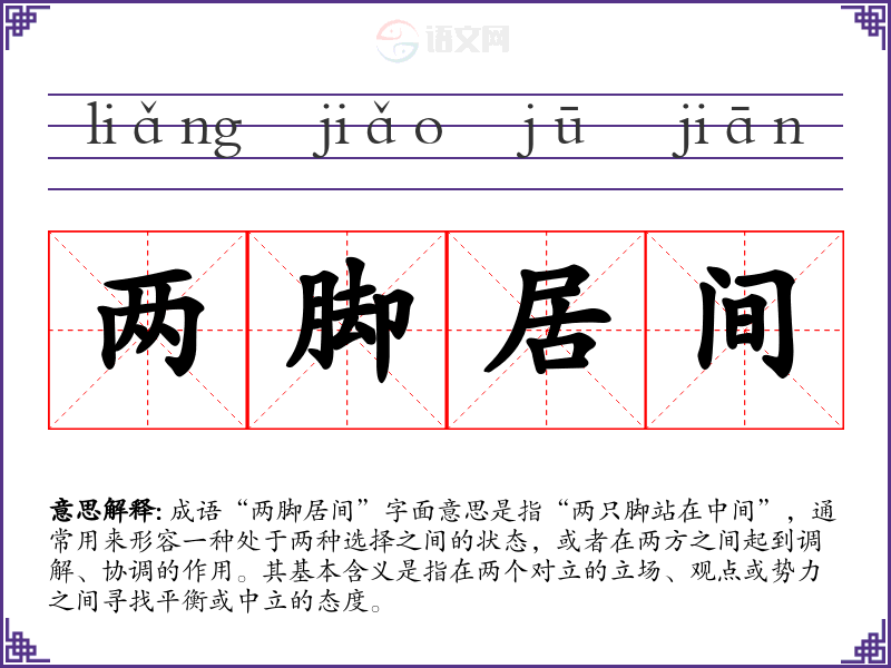 成语“两脚居间”字面意思是指“两只脚站在中间”,通常用来形容一种处于两种选择之间的状态,或者在两方之间起到调解、协调的作用。其基本含义是指在两个对立的立场、观点或势力之间寻找平衡或中立的态度。