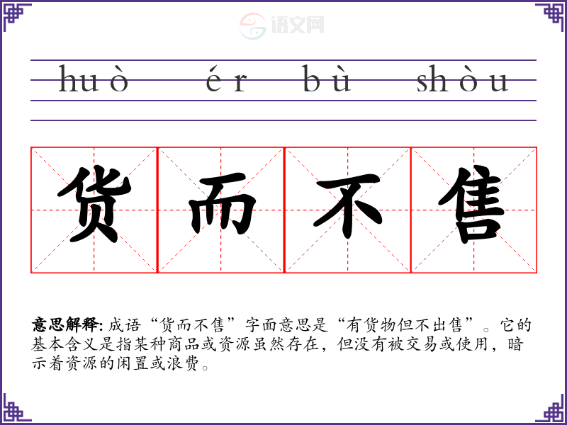 成语“货而不售”字面意思是“有货物但不出售”。它的基本含义是指某种商品或资源虽然存在,但没有被交易或使用,暗示着资源的闲置或浪费。