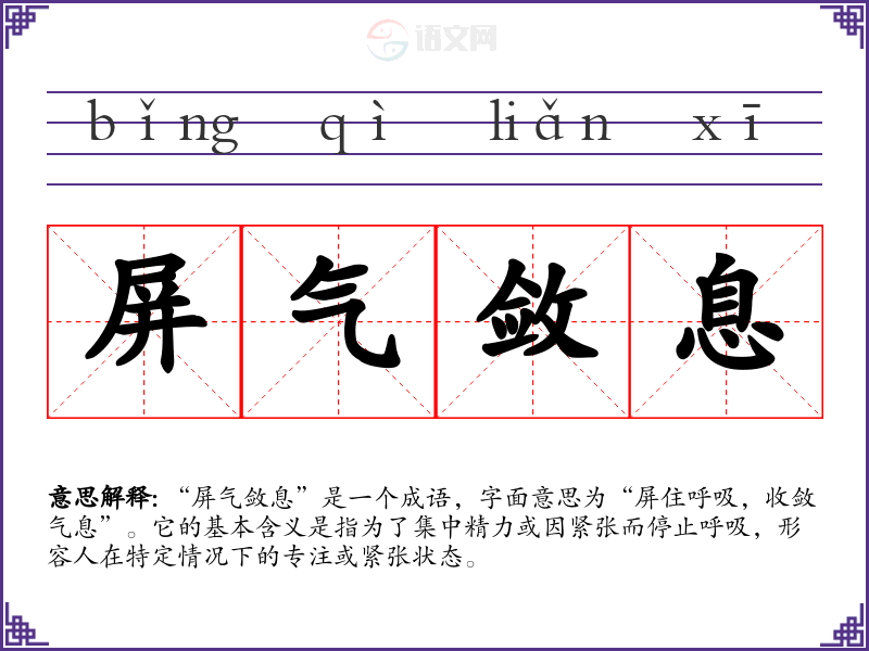 “屏气敛息”是一个成语,字面意思为“屏住呼吸,收敛气息”。它的基本含义是指为了集中精力或因紧张而停止呼吸,形容人在特定情况下的专注或紧张状态。