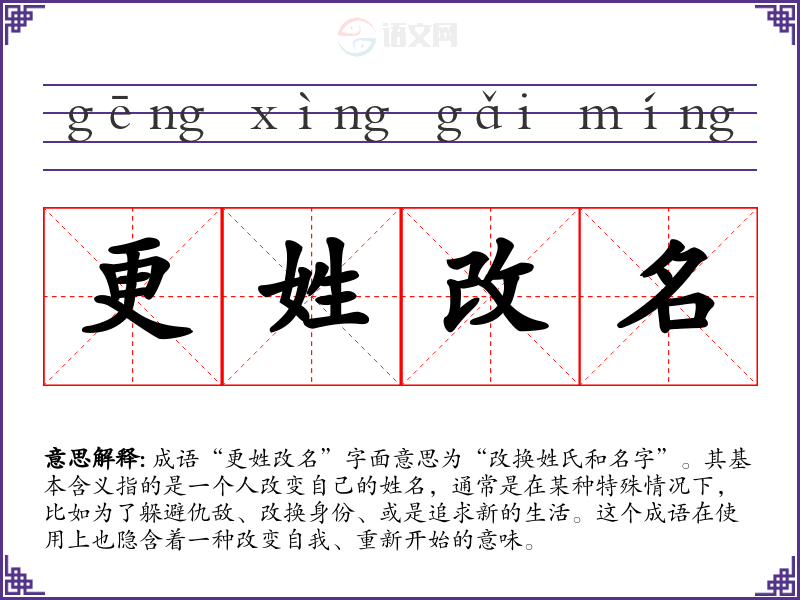 成语“更姓改名”字面意思为“改换姓氏和名字”。其基本含义指的是一个人改变自己的姓名,通常是在某种特殊情况下,比如为了躲避仇敌、改换身份、或是追求新的生活。这个成语在使用上也隐含着一种改变自我、重新开始的意味。