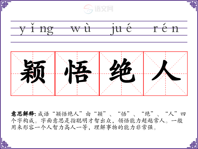 成语“颖悟绝人”由“颖”、“悟”、“绝”、“人”四个字构成。字面意思是指聪明才智出众,领悟能力超越常人。一般用来形容一个人智力高人一等,理解事物的能力非常强。